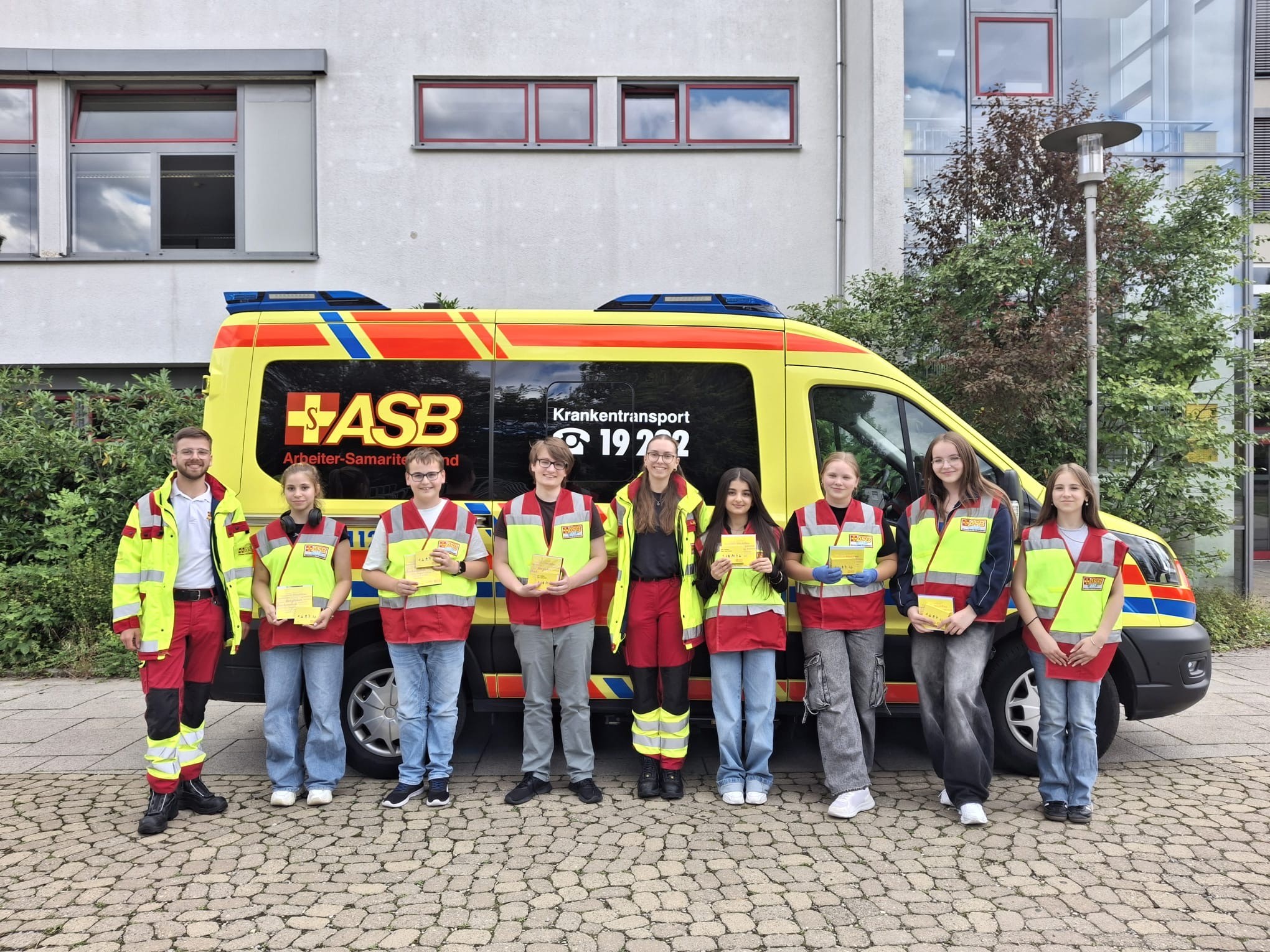 Alle Schulsanitäter haben vom ASB Region Oberschwaben Nord eine 30-stündige Erste Hilfe-Ausbildung erhalten. Zusätzlich erhielten sie eine Einweisung in die Bedienung der medizinischen Geräte im Einsatzrucksack und eine Unterrichtung über Einsatztaktik.